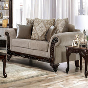 PANOZZO Loveseat, 68"L X 35"W X 31"H (SEAT HT: 22", SEAT DP: 22"), 95lbs. For a non-custom made sofa collection, this looks remarkably stunning. Intricate wood trim starts from the cabriole style legs and dances along the skirt of the sofa, finally making its way up to the rolled armrests. Every delicate faux carving accentuates the shape of the seating. Chenille fabric covers the seat cushions and the frame. Ornate textile prints grace the front of the oversized throw pillows, with the smaller ones in a solid color with reflective sheen. All together, it's a masterpiece that belongs in a gallery as much as it belongs in your living room.