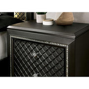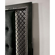 Give your house a high roller suite with this ravishing bed. Every single inch of this ensemble holds something for you to enjoy, all the way down to the silver toe carved bun feet. Pebble boxed paneling canvases the collection's drawer faces and headboard side paneling. This unmistakable paneling is accented by beveled mirror trimming and acrylic encrusted drawer handles. The play on shape and texture is not lost on the headboard's button tufted fabric mantle, raised just above the pebbling and back lit by LEDs.
