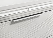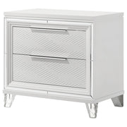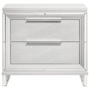 Complete your bedroom ensemble with this elegant 2-drawer nightstand, designed with a modern Italian aesthetic. The white finish, accented with mirror framing and polished chrome metal hardware, creates a striking look. Featuring picture framed recessed panels with an embossed herringbone graphic pattern, this nightstand offers both style and functionality. The top drawer includes cord management access, making it perfect for your rechargeable devices. Crafted from rubberwood, MDF, and mirror, this nightstand is a luxurious addition to any bedroom. Key Features: • 2-Drawer modern Italian design with a striking white finish • Picture framed recessed panels with embossed herringbone graphic patterns • Mirror framing and polished chrome metal hardware • Top drawer includes cord management access • Crafted from rubberwood, MDF, and mirror