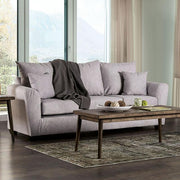 CROYDON Sofa, 85"L X 34"W X 38 1/2"H, 100lbs. A unique combination of casualness and charm is the bread and butter of this sofa. It features ever-so-slightly flared arms, rounded for maximum comfort. The back consists of loose pillows, which along with the accent pillows, are easily arranged to suit one's preferences. The simple tapered block legs are black and made of plastic for an innocuous look. It's upholstered all around in a light gray fabric that's airy and definitely inviting.