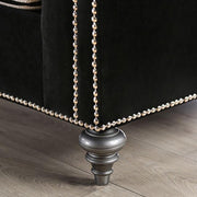MAYA Sofa, 94"L X 41"W X 37"H, 173lbs. This sofa nearly defies description! Black velvet upholstery, white knit cushions, nickel rounded feet, gleaming nailhead trim... not for the lite of heart! It's an eccentric ensemble, complete with a wild assortment of accent pillows.