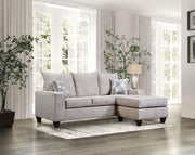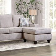 With straight lines and a simple silhouette, this sectional comes off as stylishly relaxed. Wide box cushion seats are paired with removable back pillows all with welt-trimmed edges and upholstered in soft chenille. The colors add to the casual vibe - a neutral beige hue offers a solid foundation for the decorative pillows with abstract designs that work with a wide variety of home decor. The chaise is a movable ottoman that can be positioned on the left or on the right.