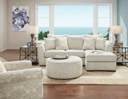 SALTNEY Sectional, 95 1/2"L X 67"W X 39"H, 140lbs. Here is a petite sectional conceived in part to be cost-efficient, elevated by grand design. The Ivory-hued sofa with connecting chaise-lounge serves as the centerpiece, an elegant deluxe style of classic stature. Slightly curved and flared arms are accented by welt-cord trim while the flat wood feet are barely visible. The gorgeous piece includes pillows featuring pattern styles that correspond directly to those of the recommended accent chair and ottoman, culminating in a exciting-yet-subtle theme.