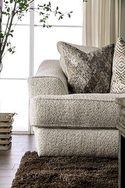 Bright grays and whites work in harmony to produce this stunning set. Welt trim outlining the collection arms and cushions and a unique textured fabric give each piece a timeless feel. Cushions are reversible offering impeccable comfort with spring seats and webbed back suspensions. Included pillows with ashy graphics are filled with luxurious down fiber bland. The off-white color adds to this allure - a neutral that works so well with most home motifs.