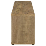 Center your entertainment set-up in this charming farmhouse TV stand. Featuring melamine paper in a mango finish, the console offers ample storage and plenty of charm. Layered coloring mimics the depth of true wood grain, while roughhewn saw marks add a sense of authenticity and dimensionality. Four cabinets open to reveal hidden storage, perfect for keeping media and gaming essentials tucked away. A center shelf is just right for a gaming console or media components, allowing for air circulation and line of sight for remote controls. Key Features: • Charming farmhouse TV stand with melamine paper in mango finish • Layered coloring mimics depth of true wood grain • Roughhewn saw marks add authenticity and dimensionality • Four cabinets open to reveal hidden storage • Center shelf perfect for gaming console or media components