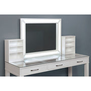 It's a stunning white set with an illuminated mirror, ensuring the beauty of whomever sits upon the cushioned seat.