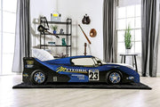 DUSTRACK Twin Bed, Blue, 82 1/2"L X 41 1/2"W X 23 1/2"H, 94.35lbs. For those aspiring race car drivers, here's the perfect bed to feed their aspirations! With replicated wheels and sponsorship markings, this race car bed is a dreamer's delight. And it's sturdy, too. Metal support structure and included slat kits ensure a stable, safe, and fun space.